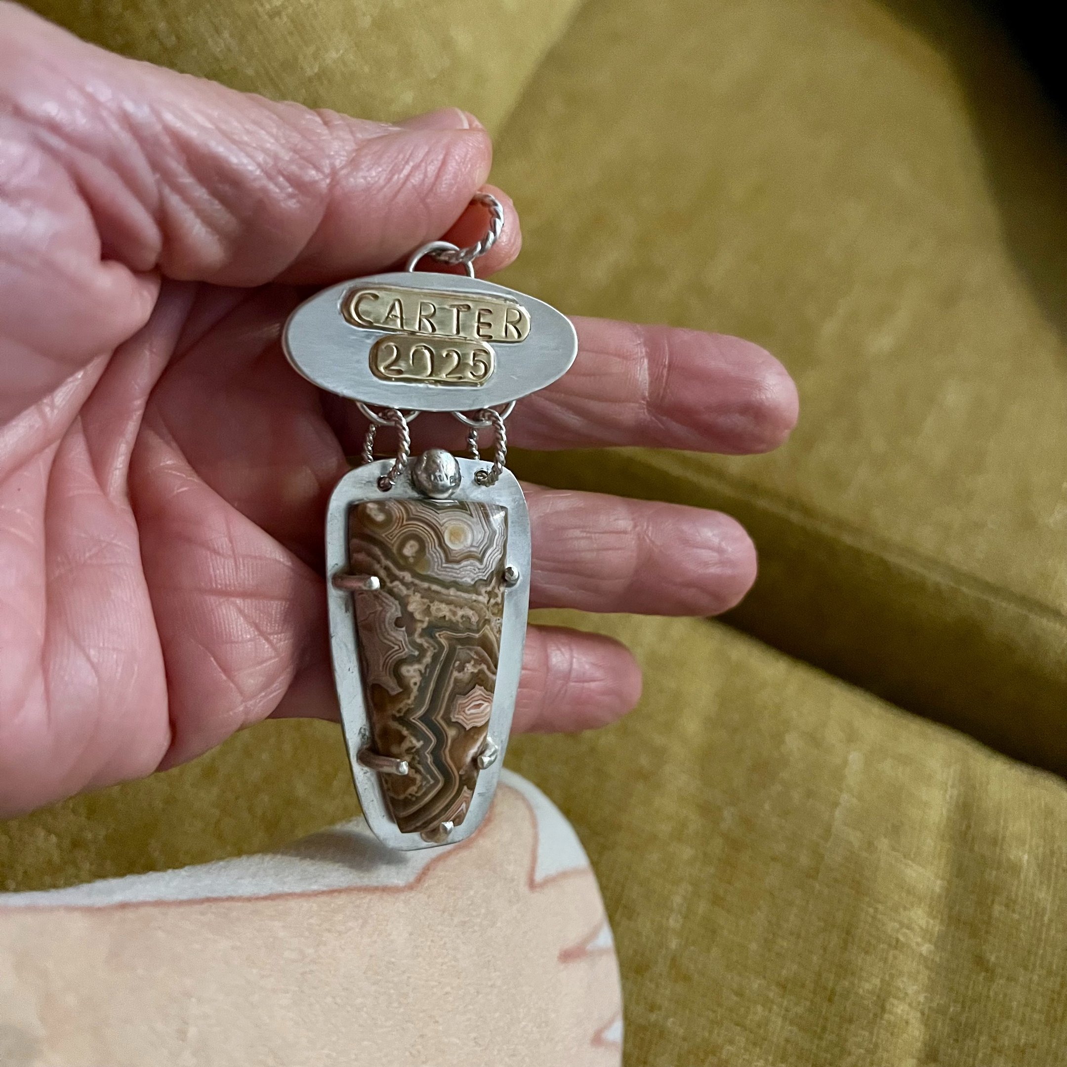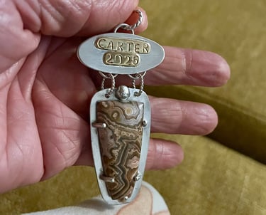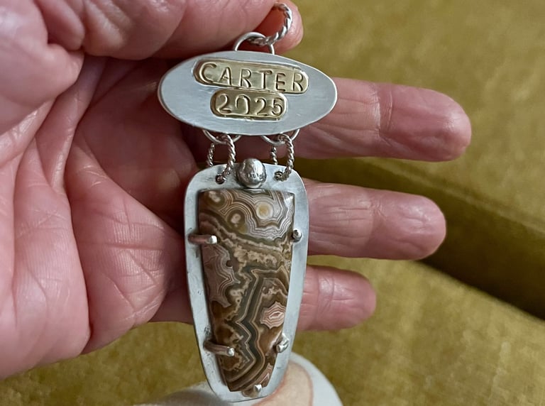 The ornament I made holds a piece of crazy lace agate, often called the “laughter stone”, believed to bring joy and emotional balance. Carter loved rocks and crystals and took great care of his collection. So, including a stone felt meaningful. As I worked on the piece, I felt close to him. I could imagine him beside me, curious and proud. The finished ornament marked 2025 and brought me genuine joy. I am already looking forward to planning next year’s and watching for a stone I know he would love. This tradition is back, with a little transformation.